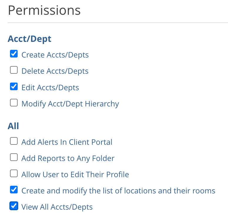 - Permissions: Grant permission for creating and modifying accts/depts and locations. This is technically optional but without permission these things can not be created or updated and will generate permission failures in the log file. br>